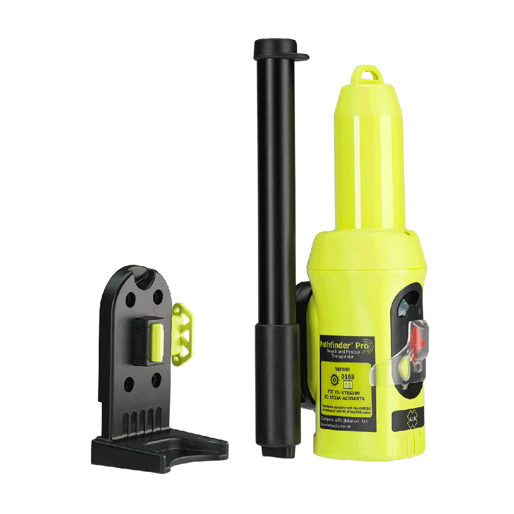 The Pathfinder Pro comes with a sleek wall mount to keep this compact SART out of the way, yet readily accessible in an emergency.  The attached telescopic pole conveniently connects to the bottom of the SART and provides maximum height and visibility out of a life craft. The SART can also be suspended inside the craft for hands-free usage.
